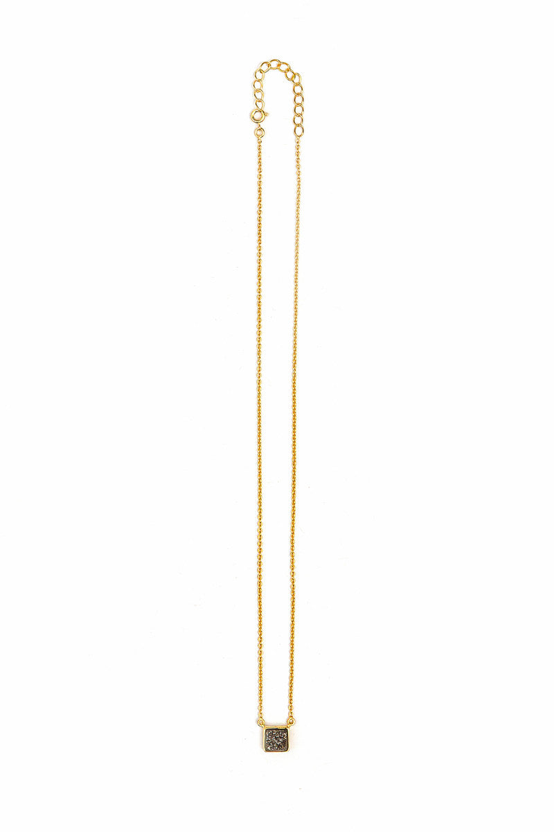 This short druzy stone necklace is made from semi-precious marcasite stone and recycled brass with gold plating.