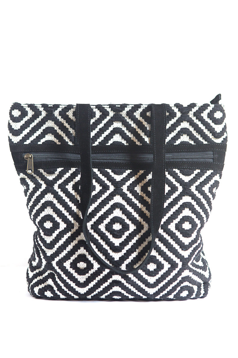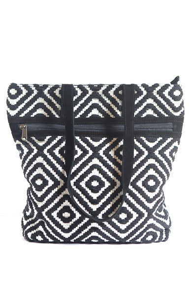 This sturdy fair trade tote bag comes in a beautiful black and white pattern. Our totes are always large enough to hold a laptop with pockets to help keep you organized.