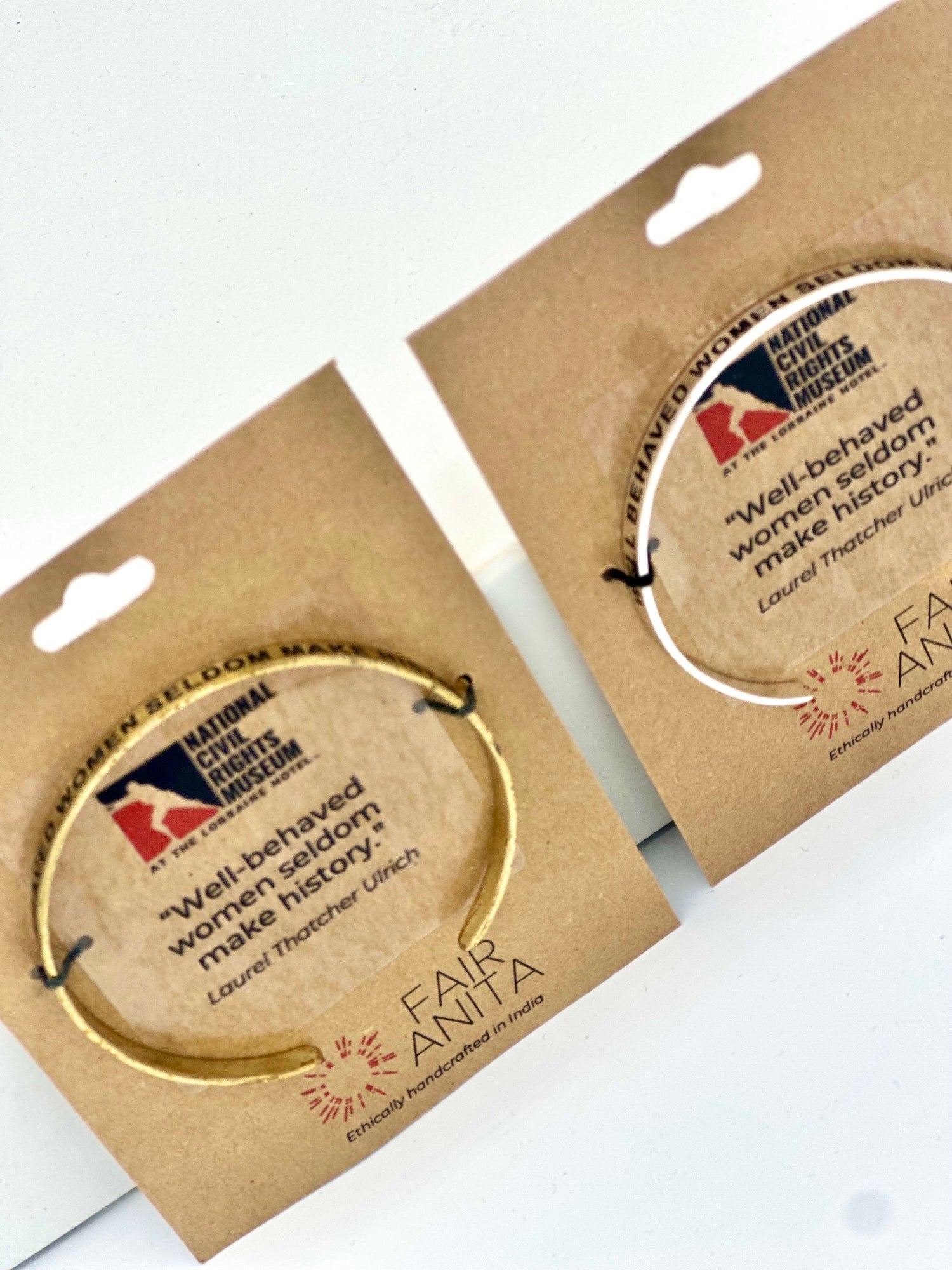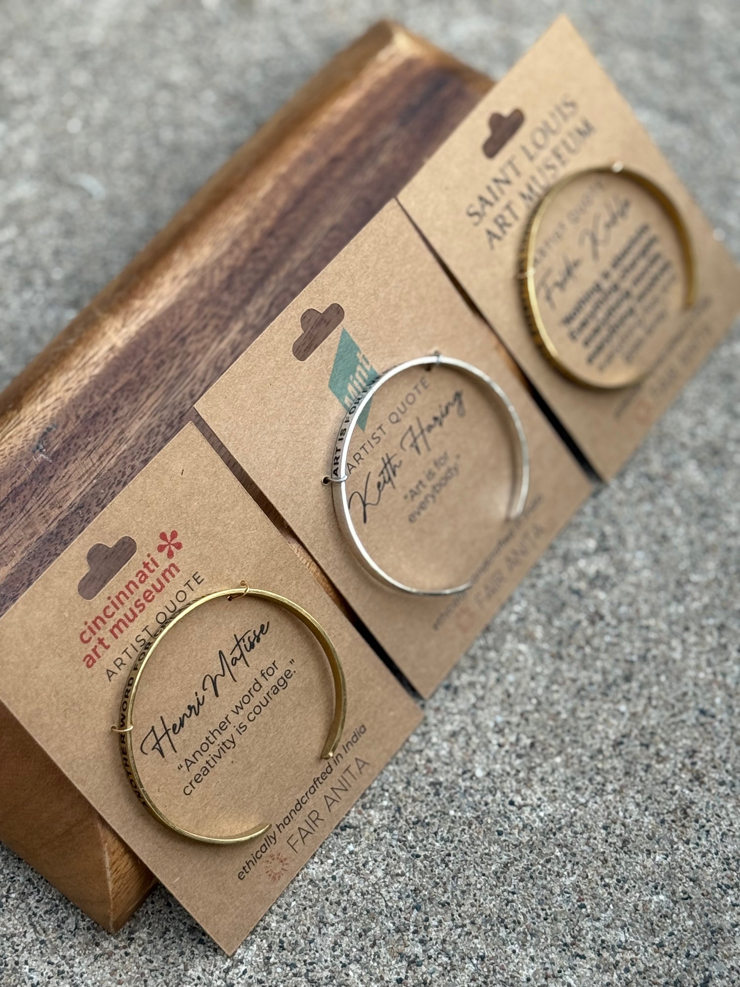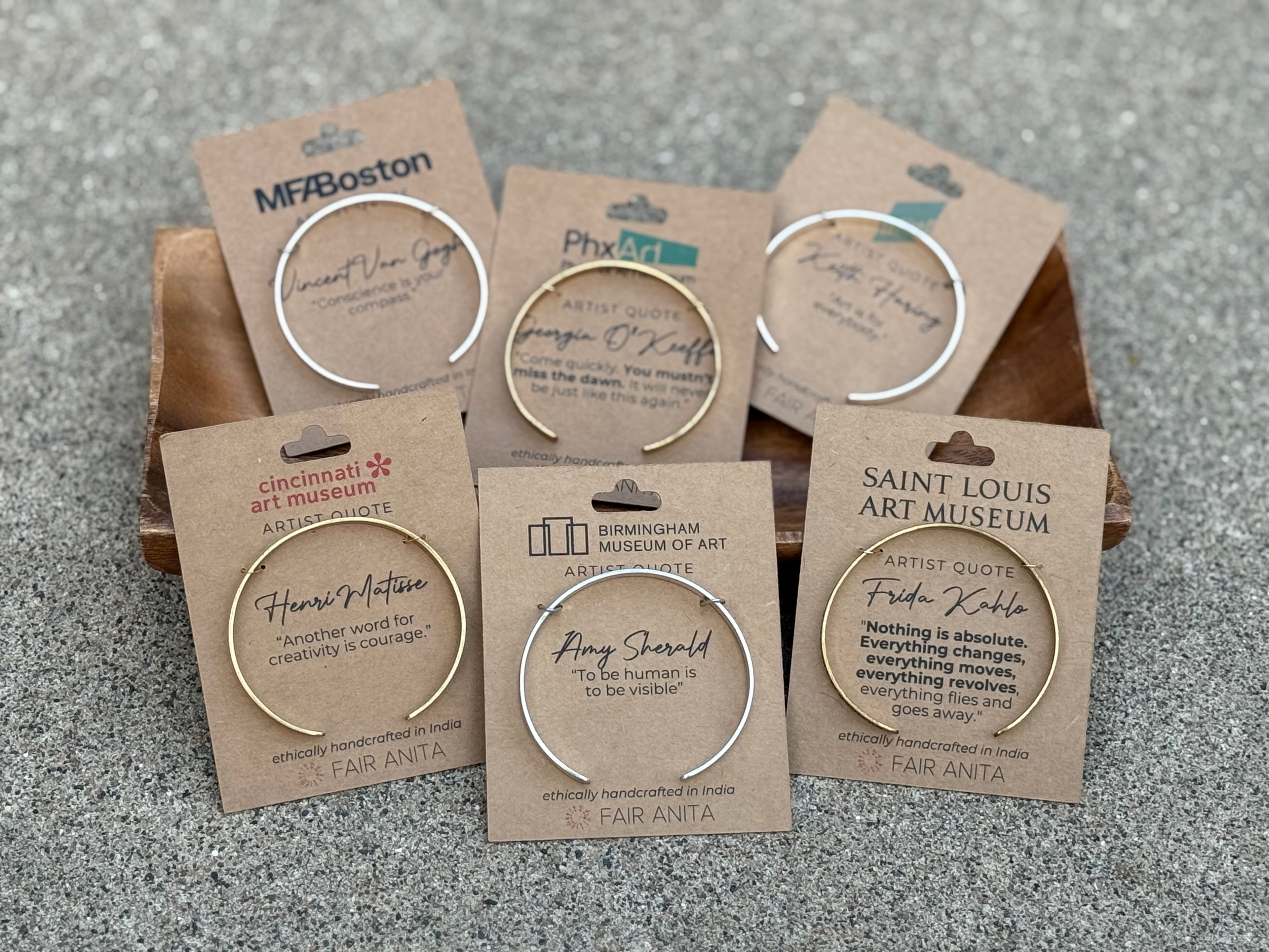 Celebrate the words of visionaries with our Muse Cuffs—wearable art inspired by history’s greatest artists, scientists, revolutionaries, and thinkers. Each ethically handcrafted bracelet carries an excerpt of a powerful quote, with the full words and author printed on the packaging. Wholesale accounts may customize orders of 24+ with their own logo, creating a unique keepsake for visitors. These adjustable bracelets are made from recycled metal, nickel-free, and proudly handmade by fair trade artisans in India.