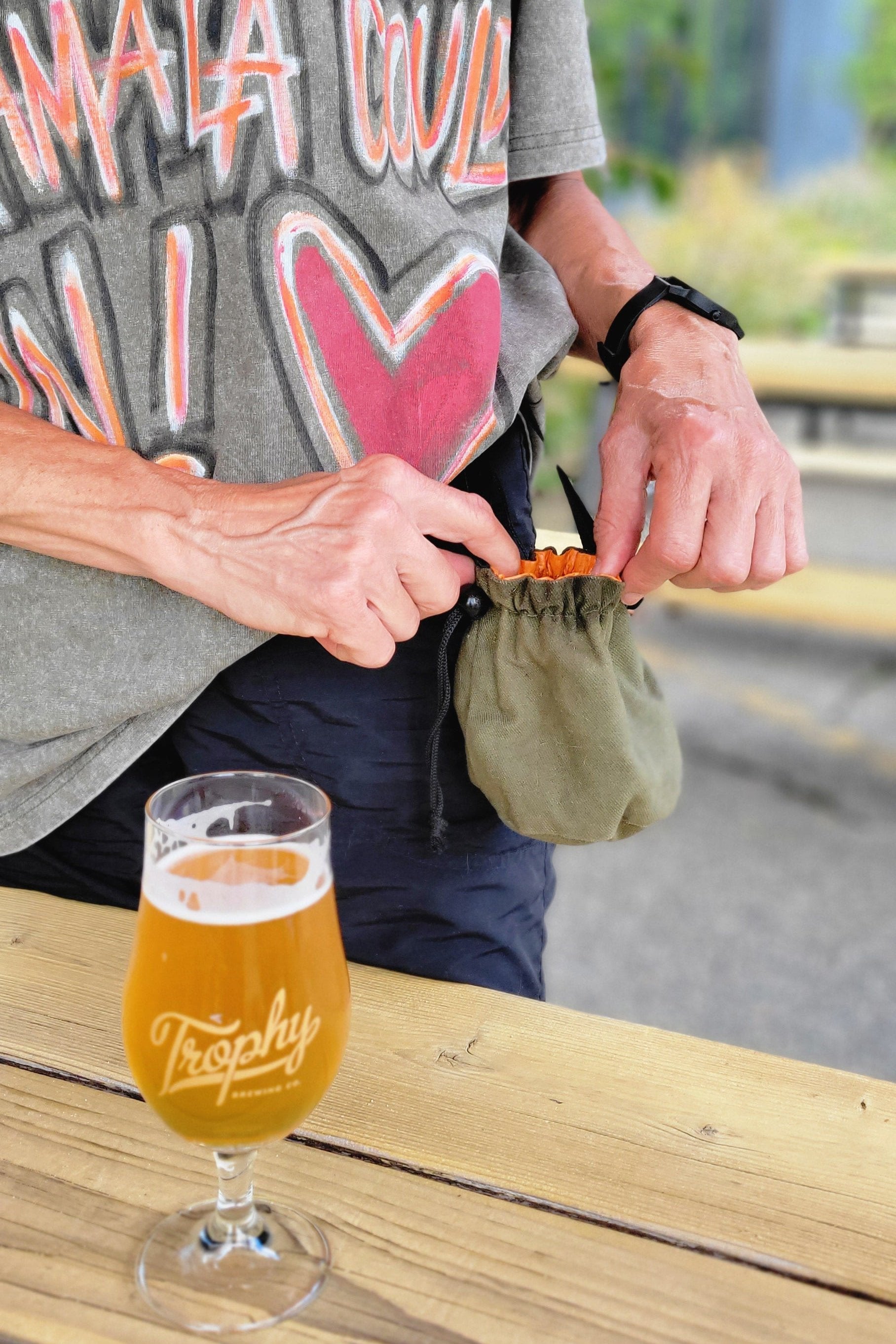Store treats for your goodest doggo in this ethically-handcrafted bag! Lining made from recycled fish food bags can easily be wiped clean. Draw string closure so pups don't start helping themselves. Snap on handle can be attached to belt loop, leash, or wrist.