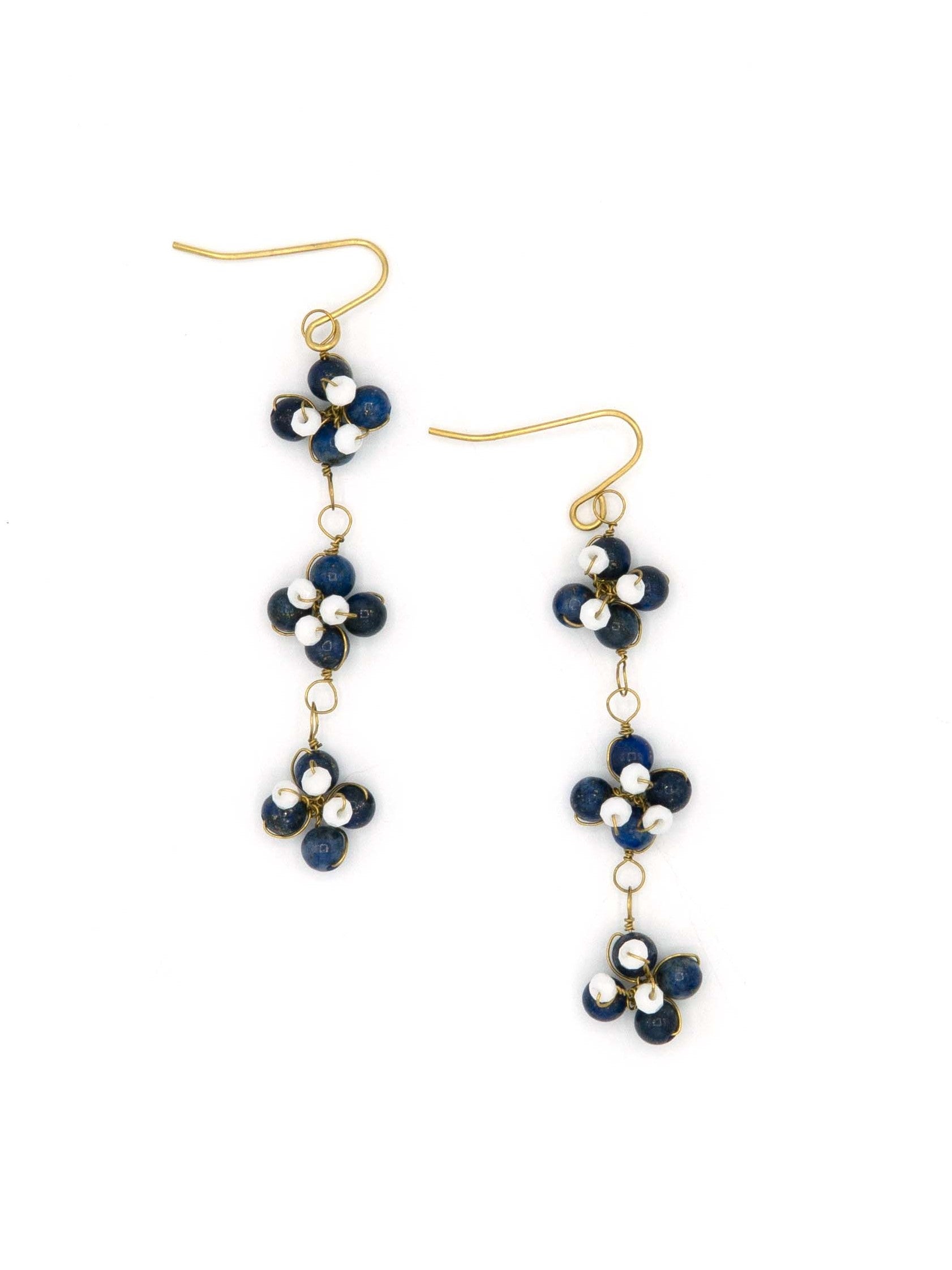 Earrings measure about 2.75". Made from recycled brass and semi-precious lapis stone. Nickel-free.