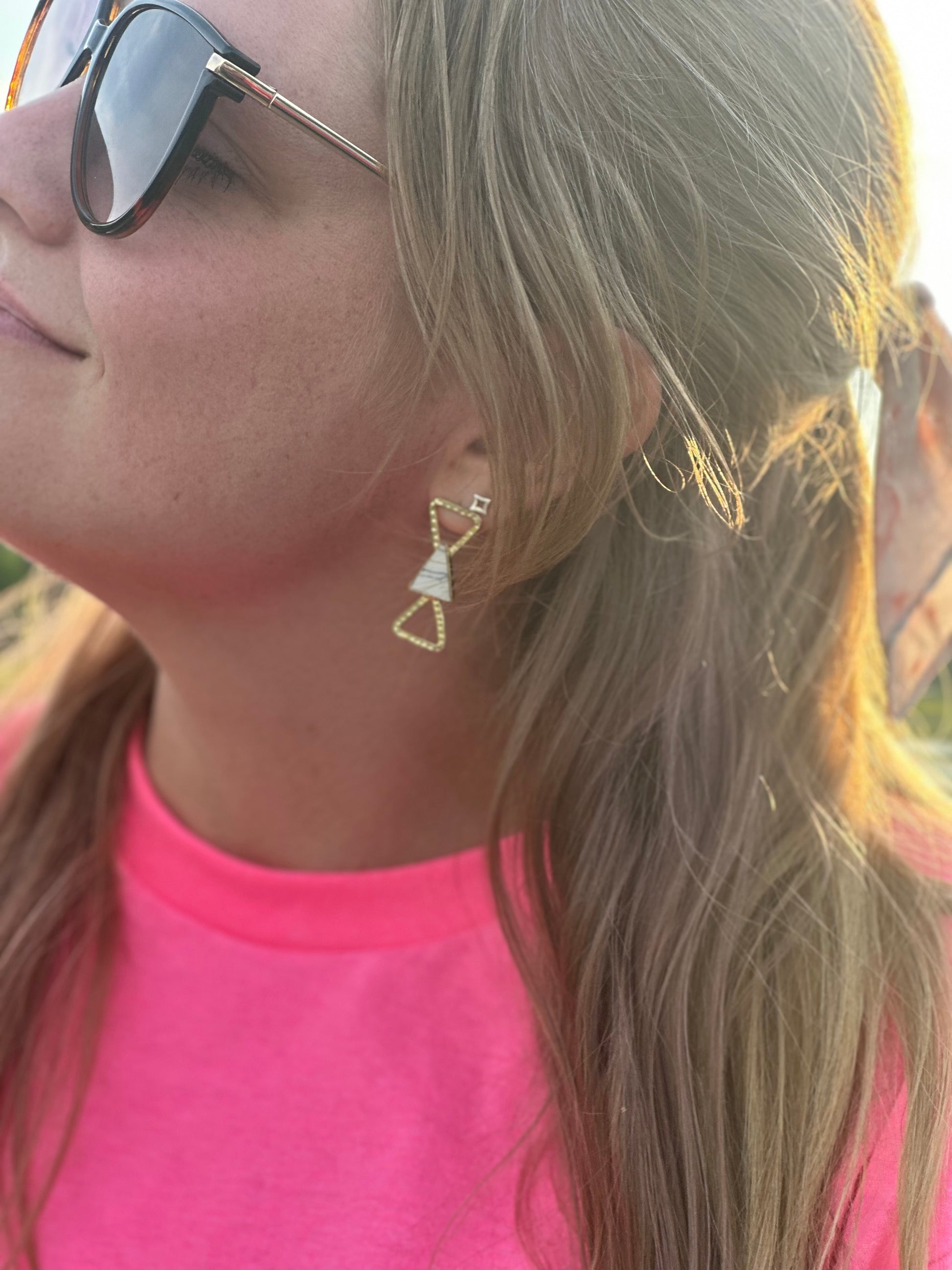 Three triangles are strung together to form these large studs. These earrings have a subtle texture with a beautiful marbled center to create a unique pair of handmade studs.