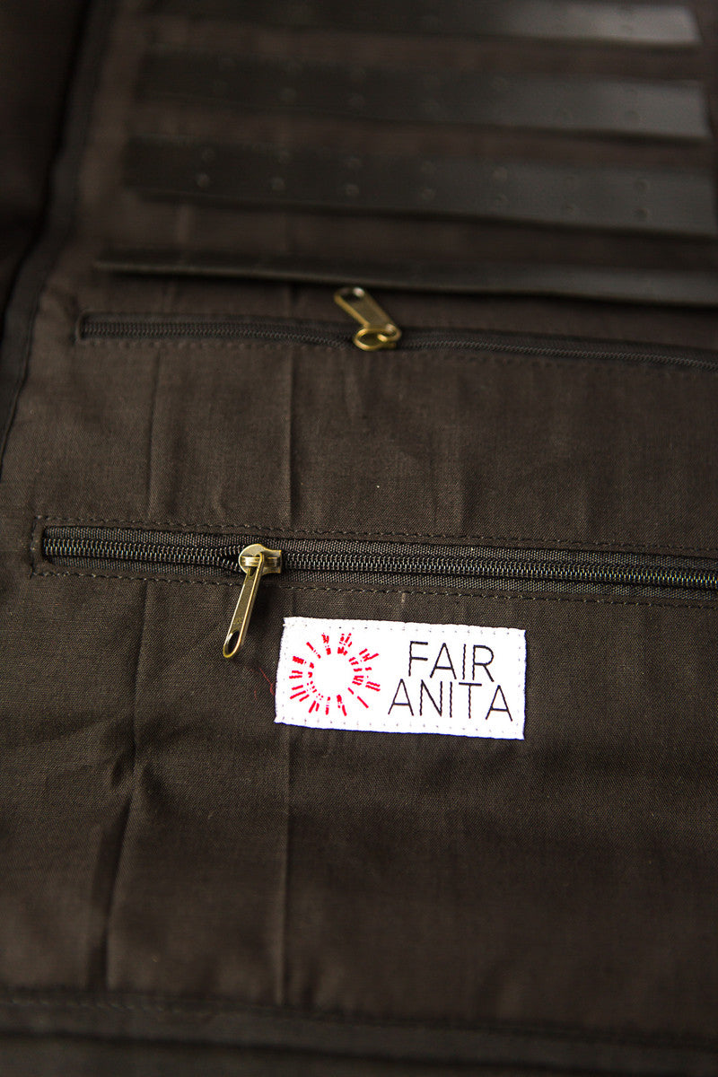 Made from handwoven organic cotton by our artisan partners in Cambodia. Screenprinted by hand using eco-friendly dyes. Accessories from vegan leather, including a loop on the back to hang the organizer.